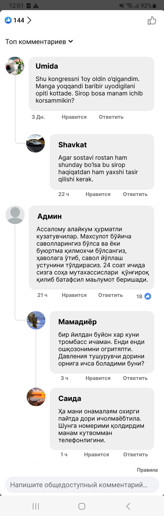Жавоб: Маҳсулотни фақат марказ орқали олса бўлади, мутахасис сизга телефон қилганидан кейин буюртма беришингиз мумкун.